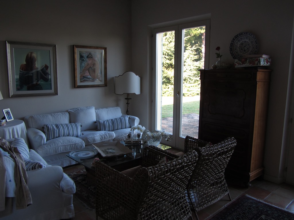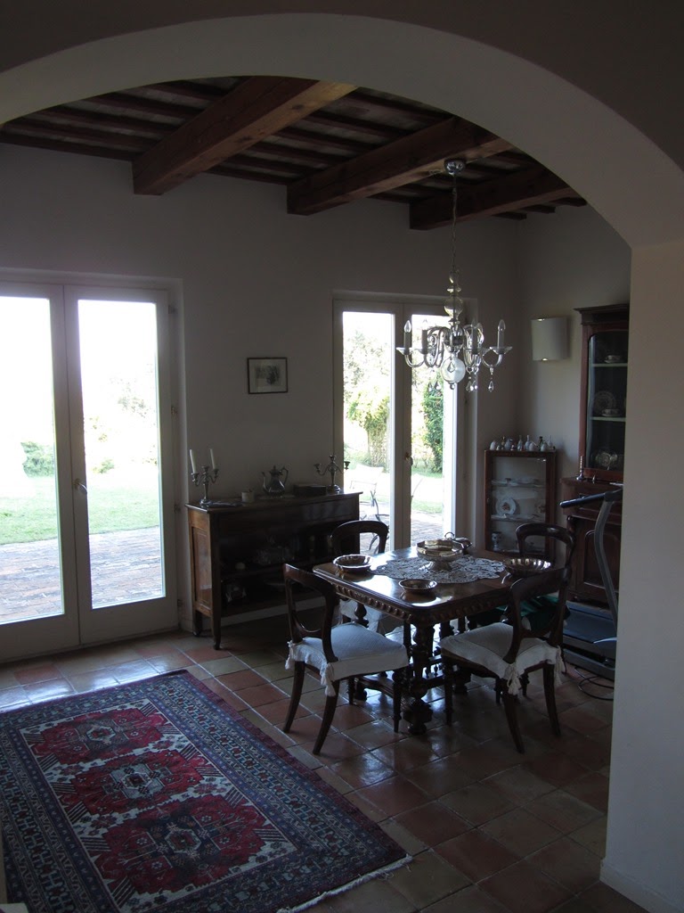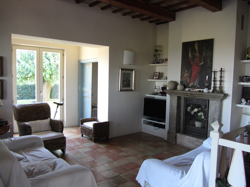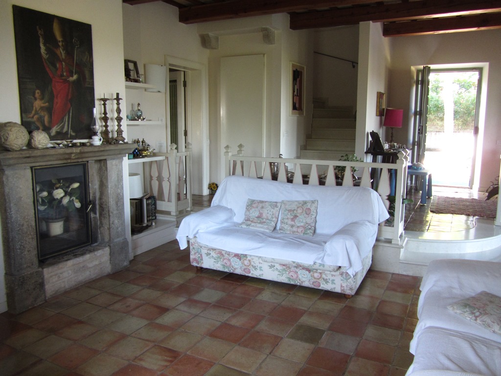 At the entrance there is a large and bright hallway and living and dining room on different floors. The arches that separate the various areas allow ample light into the rooms and above all the light that comes in through the French windows that open directlyonto the front garden. The floors are in original antique terracotta in a square shape. In the centre of the living room there is a wood burning fireplace with hot air vents, there are two doors to the living room which are original antique doors from the1700’s which lead one into the small guest bathroom and the other to a built-in cupboard/cabinet. From here we can exit to the garden or enter the large kitchen with two large windows above the work area and a French door leading to the brick and oak-beamedporch where one can comfortably dine. The kitchen, which is still very much up-to-date, also has a large, man-high wood-burning fireplace with a made-to-measure marble cooking surface, while the exterior cladding is in hand-painted ceramics.